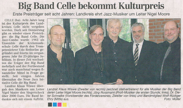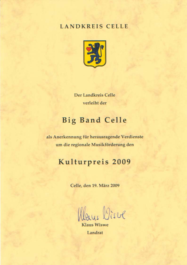 Der Landkreis Celle verleiht der Big Band Celle als Anerkennung für herausragende Verdienste um die regionale Musikförderung den Kulturpreis 2009